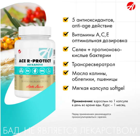 «ACE R-protect» – уникальный комплекс с научно-обоснованным действием, способствующий восстановлению перекисного гомеостаза (баланс концентраций прооксидантных и антиоксидантных компонентов), предупреждающий негативные последствия воздействия свободных радикалов.